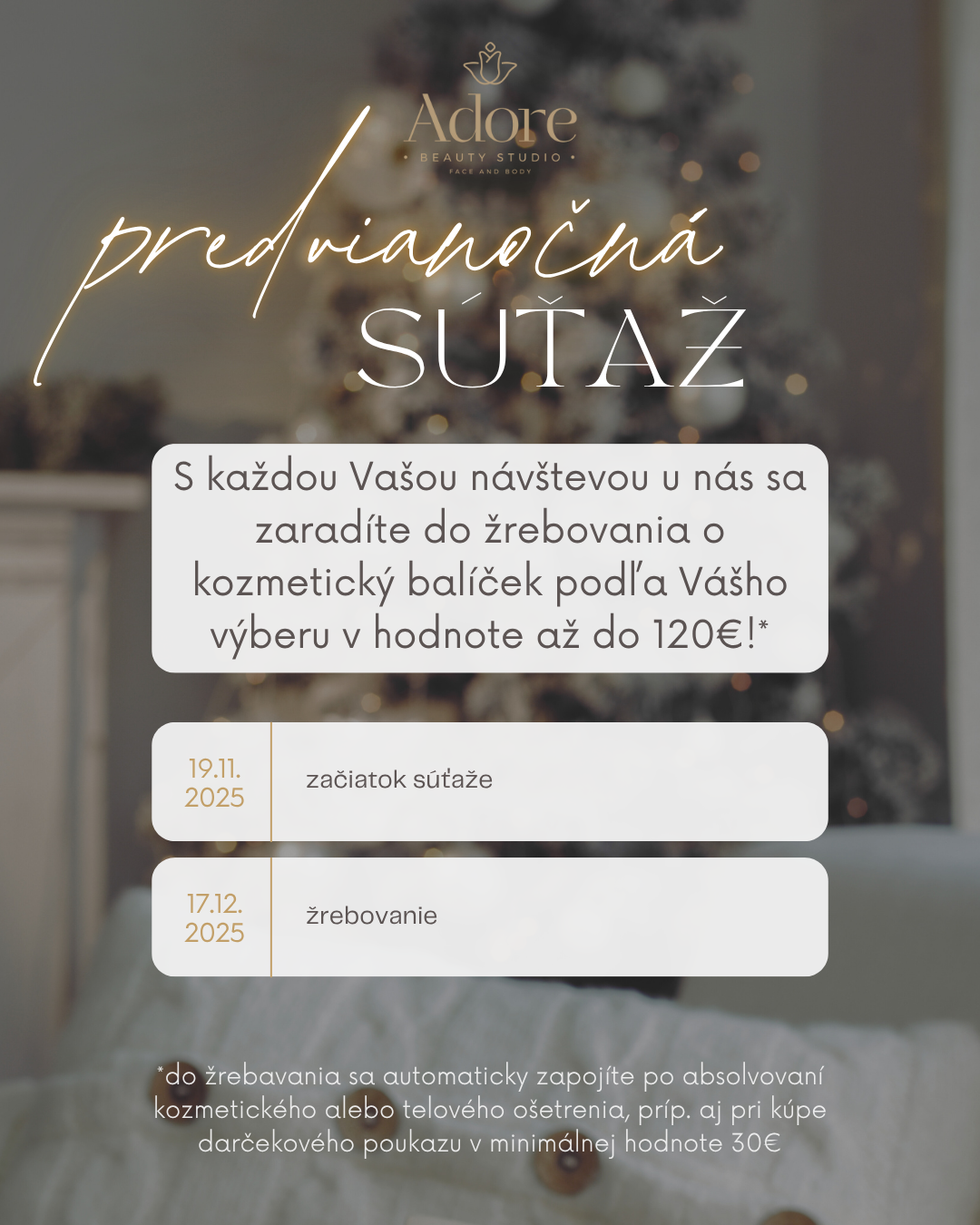 Do žrebovania sa zapojíte automaticky po absolvovaní kozmetického alebo telového ošetrenia, príp. aj pri kúpe darčekového poukazu v minimálnej hodnote 30€.
